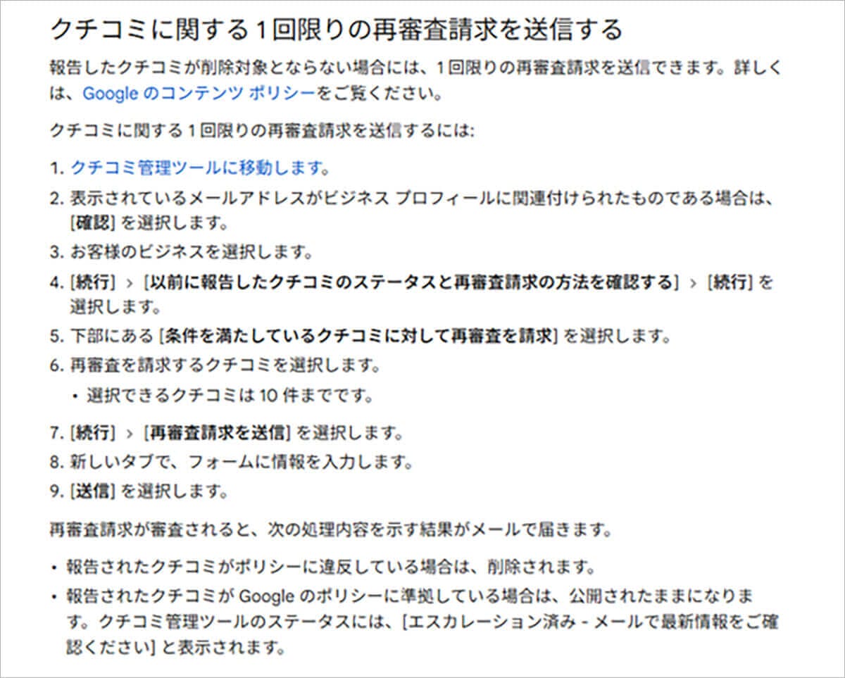 一度報告した口コミがGoogleのポリシーに違反していないと判断された場合でも、再審査を請求することが可能です。以下の手順に沿って操作してください。