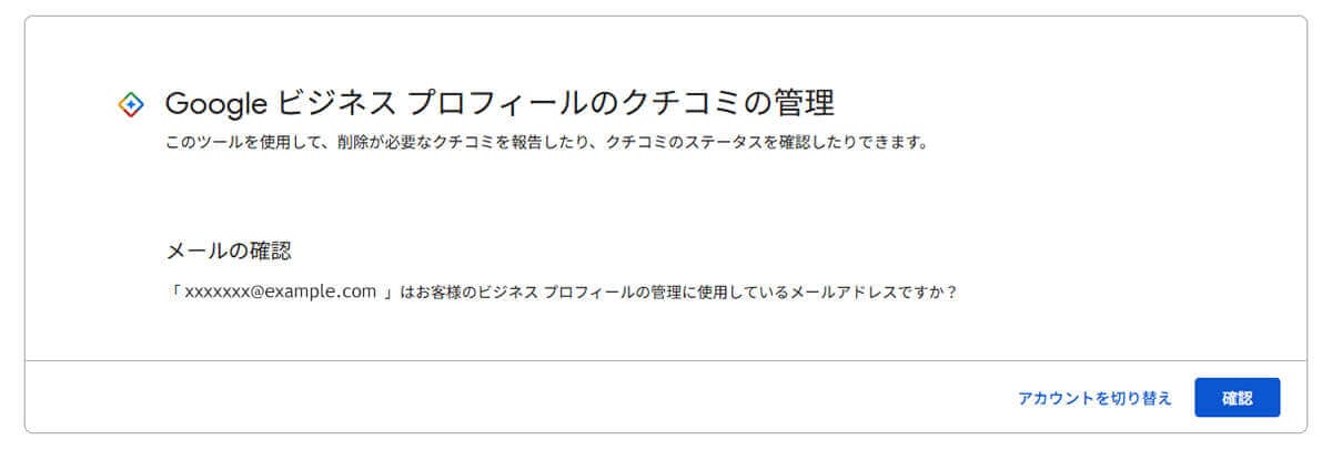ご自身のビジネスプロフィールを管理しているGoogleアカウントのメールアドレスが表示されます。内容を確認のうえで間違いがなければ「確認」ボタンをクリックします。