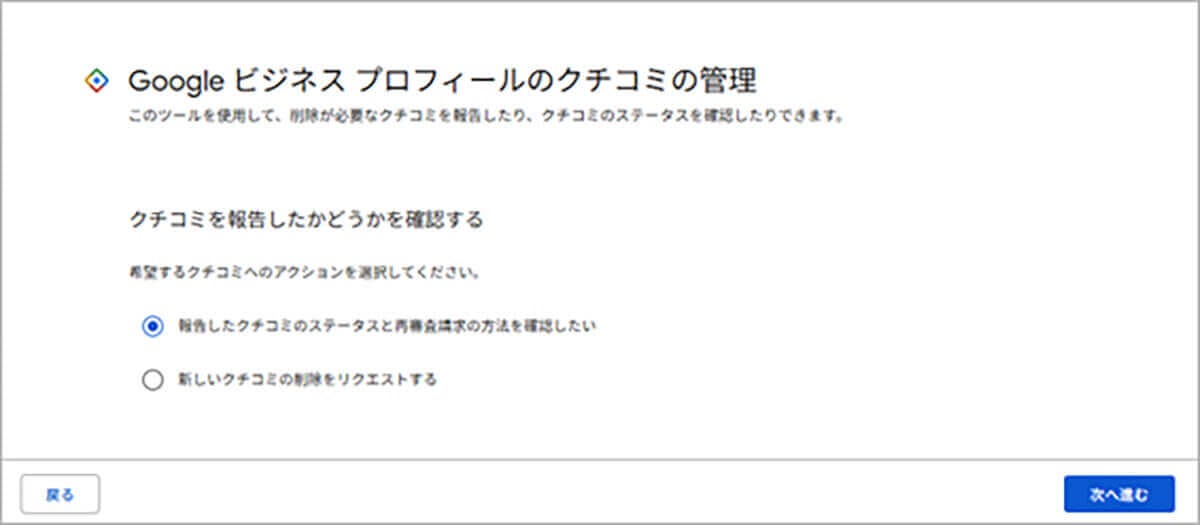 「報告したクチコミのステータスと再審査請求の方法を確認したい」にチェックをして次へ進む