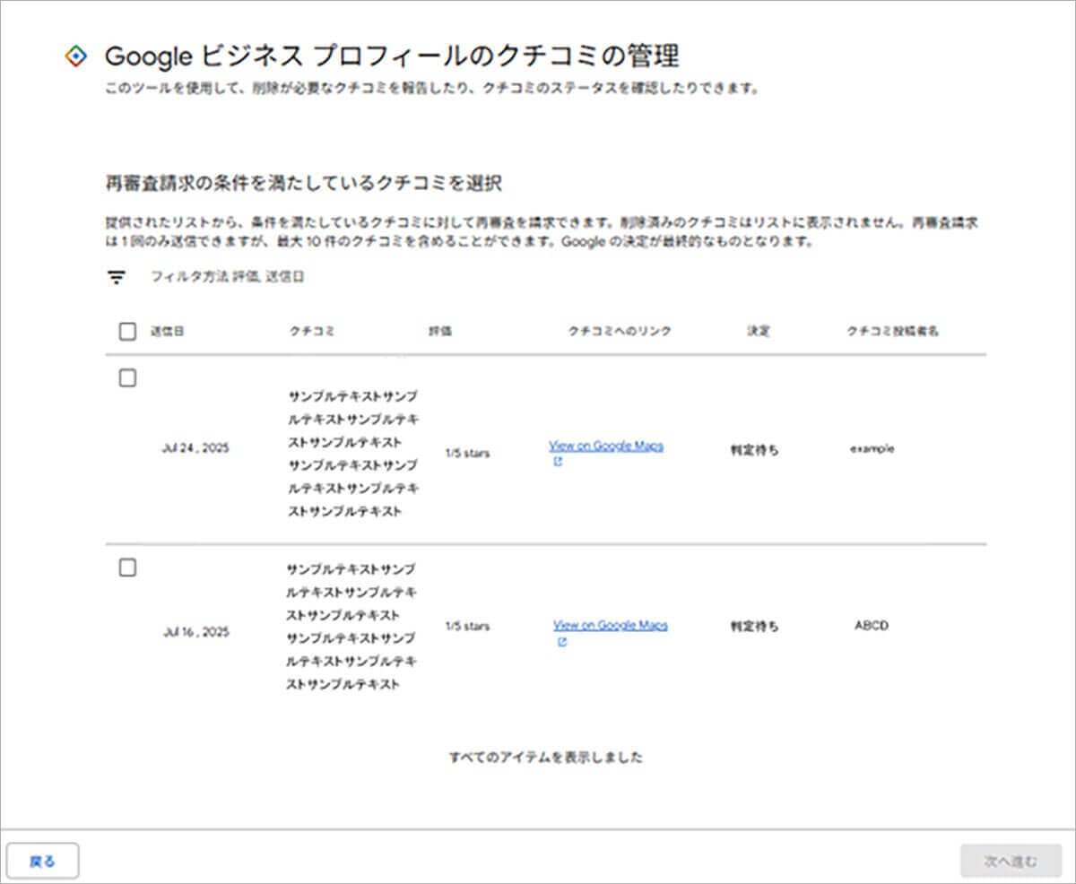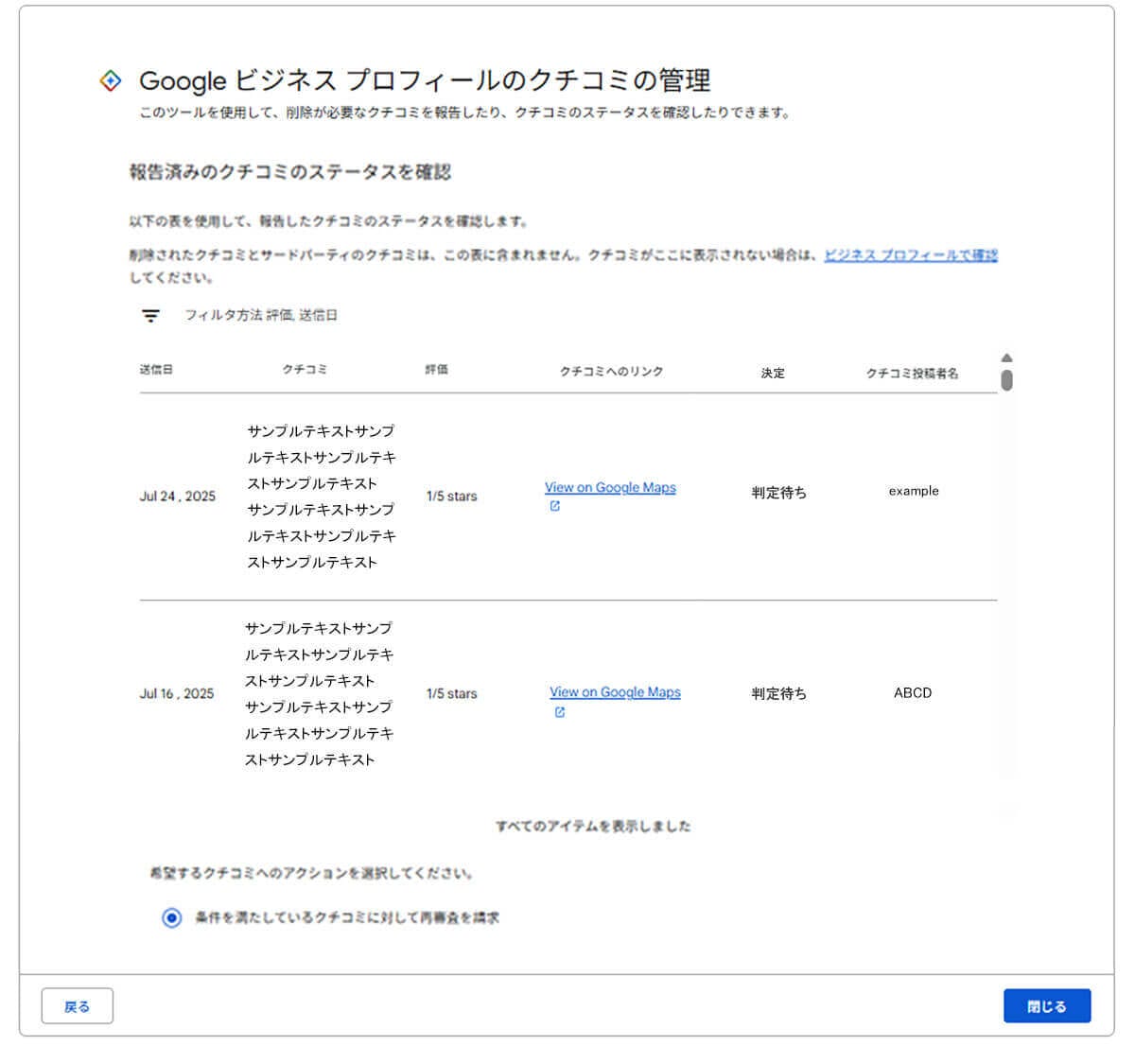 ご自身で対応できるのは、Googleのポリシー違反が明白なケースの通常の削除依頼や、証拠が揃っている場合の再審査請求までかと思います。