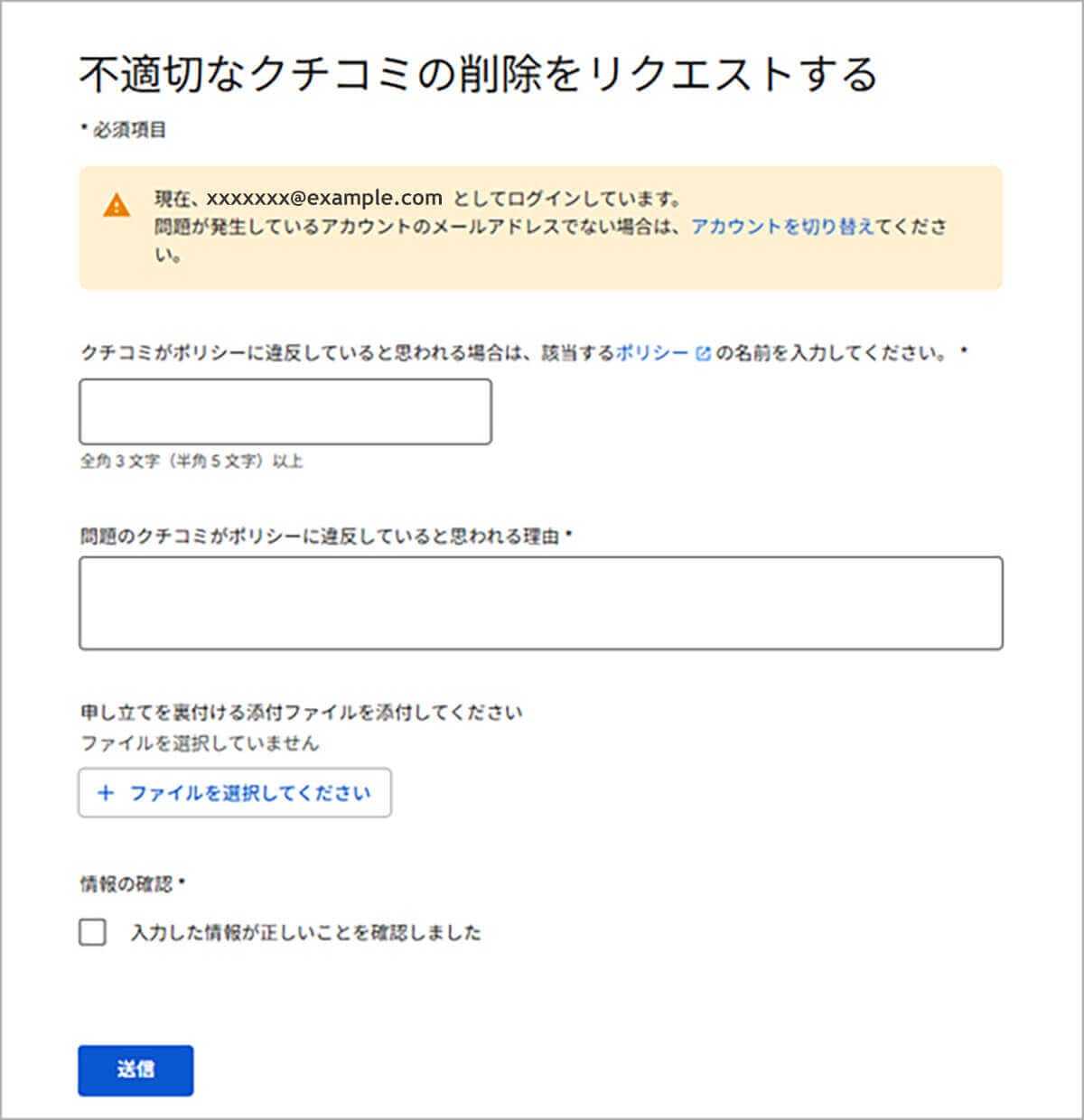 ポリシー違反が認められると、口コミが削除される可能性があります。