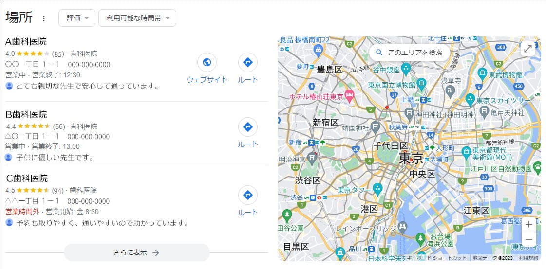 たとえば東京で歯科医院を探すため、「東京 歯科医院」とGoogleで検索します。検索結果は次のとおりです。